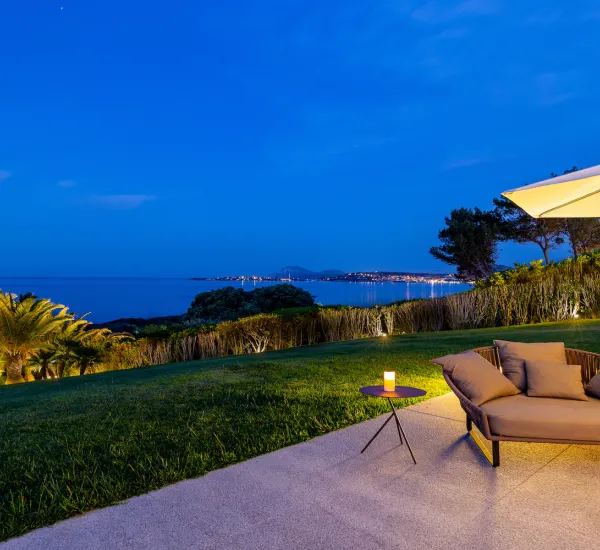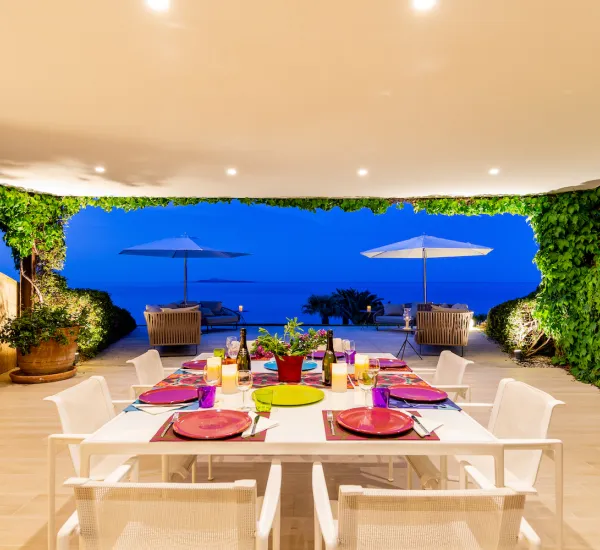 La proprietà ha una superficie abitabile di 550 mq, è costruita su un unico livello: l'edificio dell'ala destra e l'edificio dell'ala sinistra uniti da un patio con un'ampia terrazza panoramica con vista sul mare dove gli ospiti possono cenare godendo della brezza del Mar Mediterraneo e di un'incredibile vista a 270 gradi. vista su Porto Rotondo, l'Isola di Mortorio e la Baia di Cala di Volpe.