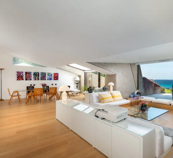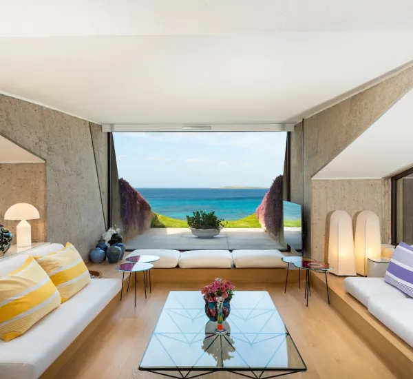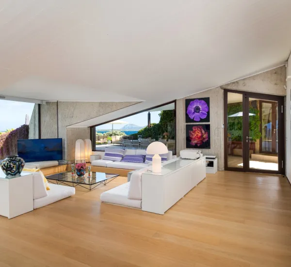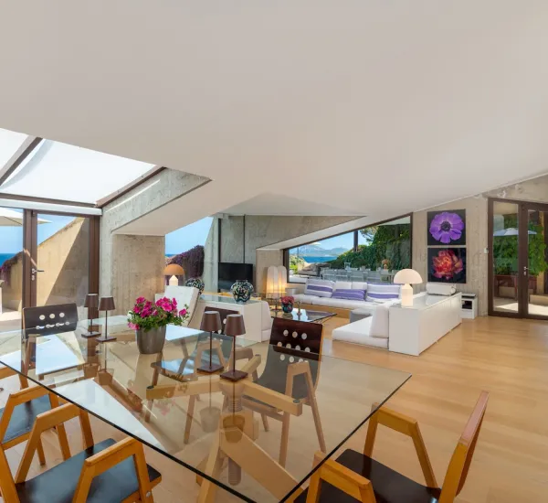 Splendidamente situata tra Porto Cervo e Porto Rotondo e progettata dal famoso architetto Ferdinando Fagnola, la villa sembra fondersi con le verdi colline sopra la Costa Smeralda in modo così perfetto che è appena percettibile dal mare. Protetto e tuttavia inondato di luce, costruito in cemento e tuttavia colorato, il design combina abilmente ciò che sembra essere opposto.