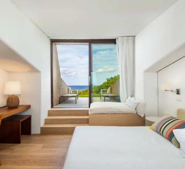 - Tre camere matrimoniali con bagno privato, terrazze solarium individuali e vista completa sul mare