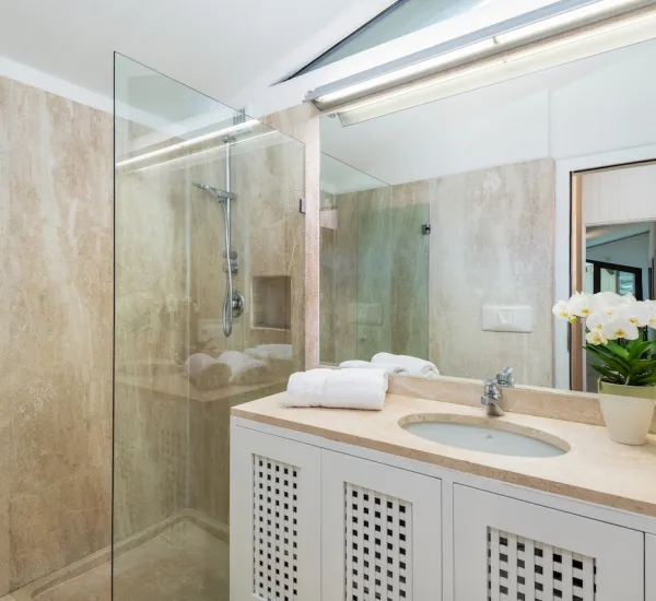 - Camera da letto principale con bagno privato, WC separato (Geberit Aquaclean) con adiacente terrazza solarium privata, doccia esterna e vista completa sul mare