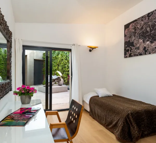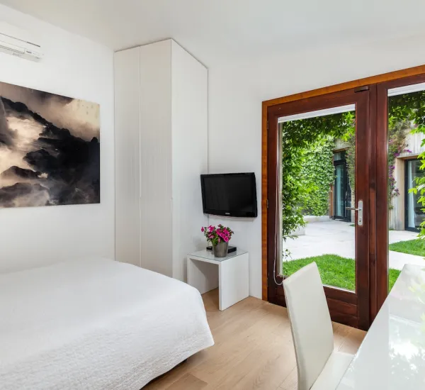 - Una camera matrimoniale con bagno privato e uscita sul patio