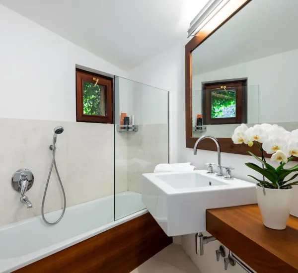 - Una camera matrimoniale con bagno privato (vasca) e uscita sul patio